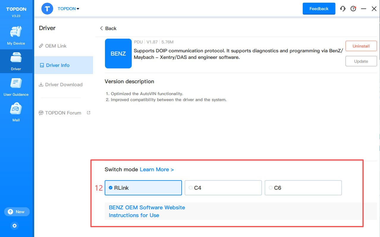 4. Click 【Driver】 > 【Driver Info】. Then click 【BENZ】 to configure the driver mode.