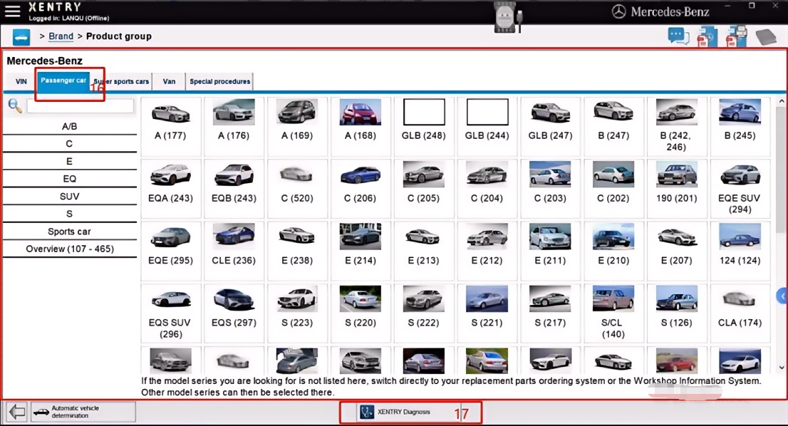 9. Click【Passenger car】 and click 【XENTRY】 Diagnosis. If the system fails to detect the vehicle, enter the vehicle model in the search bar.