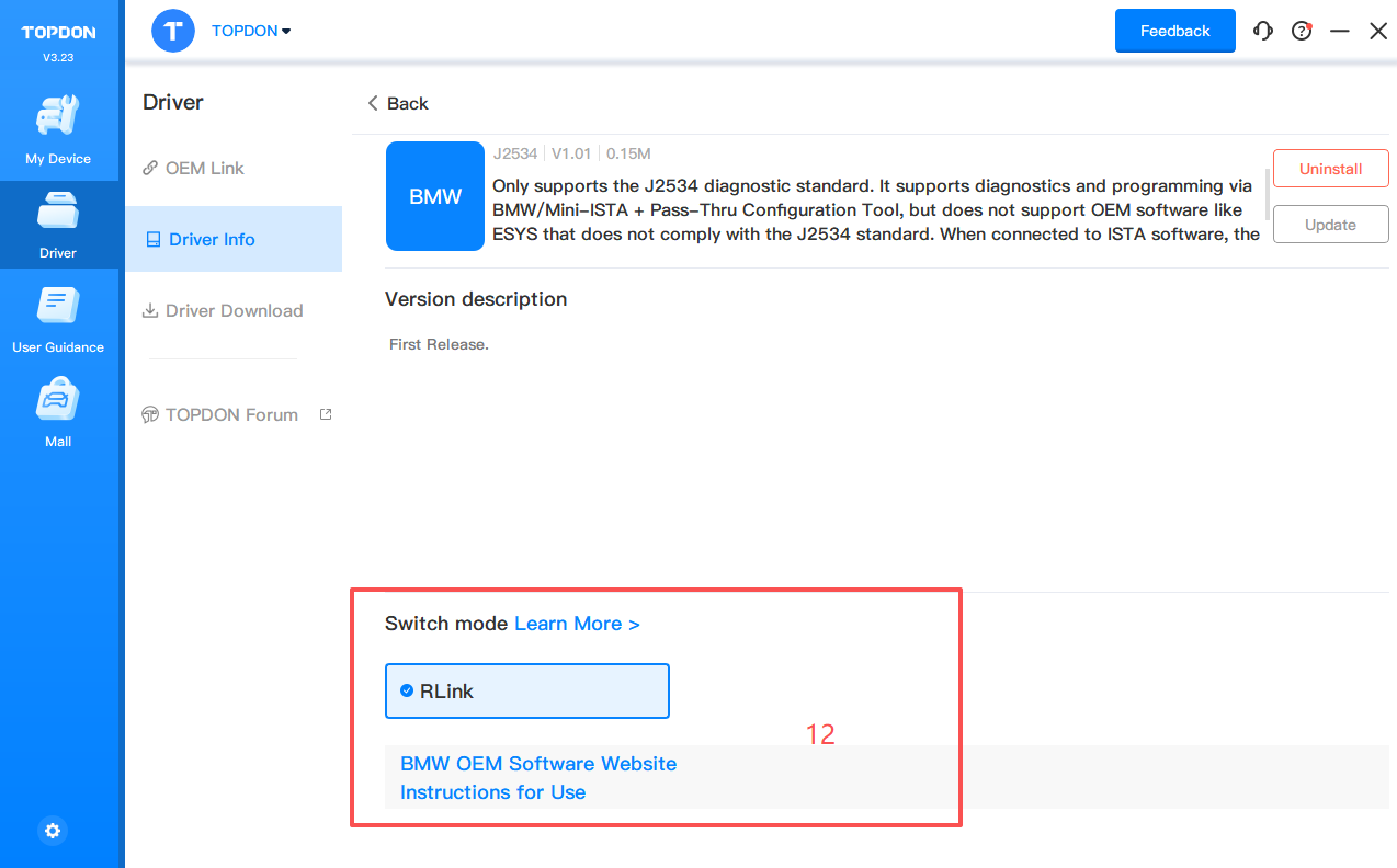 4. Click Driver > Driver Info. Then click BMW to configure the driver mode.