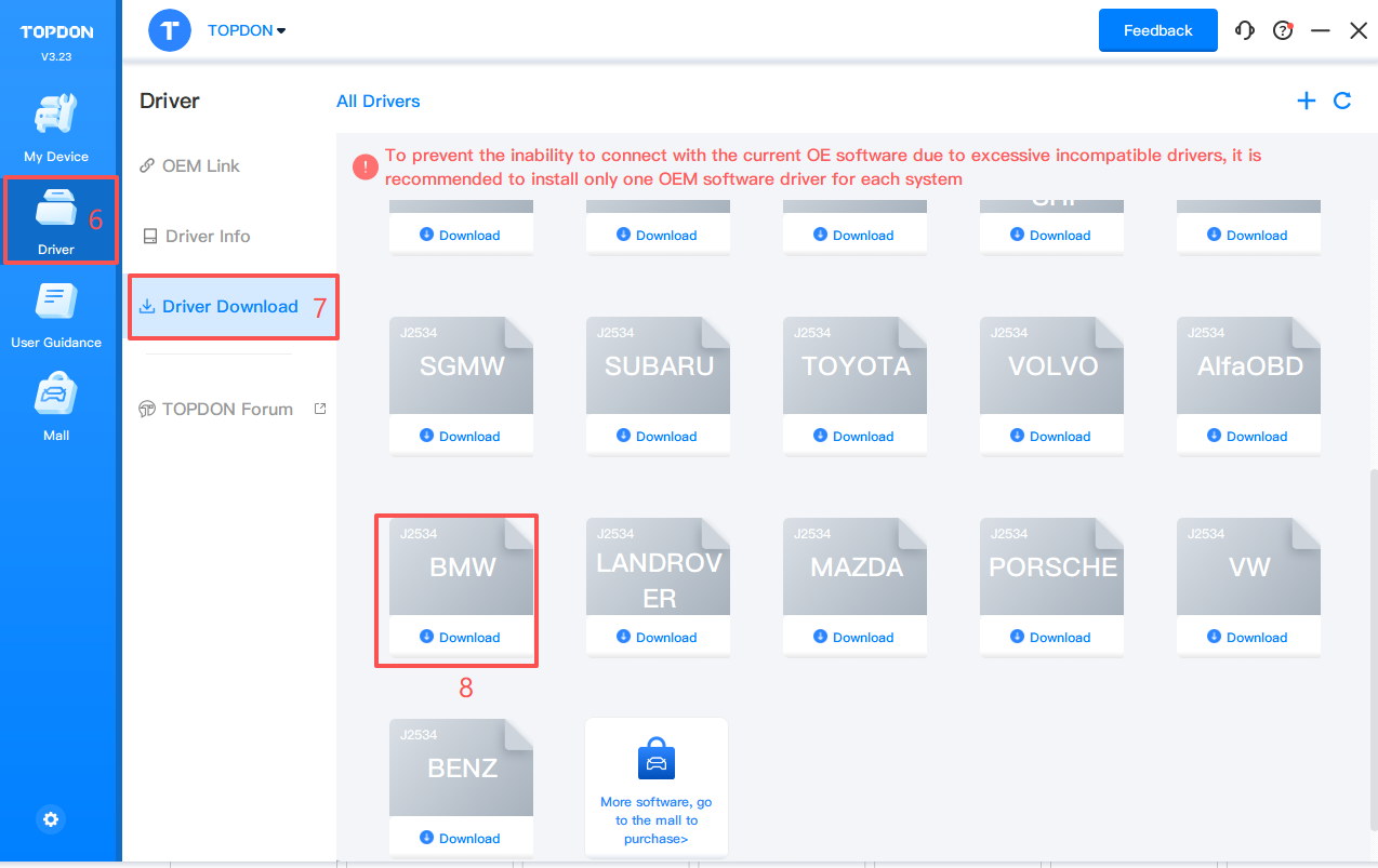 3. Click Driver > Driver Download.Click BMW and click Download to download the driver.