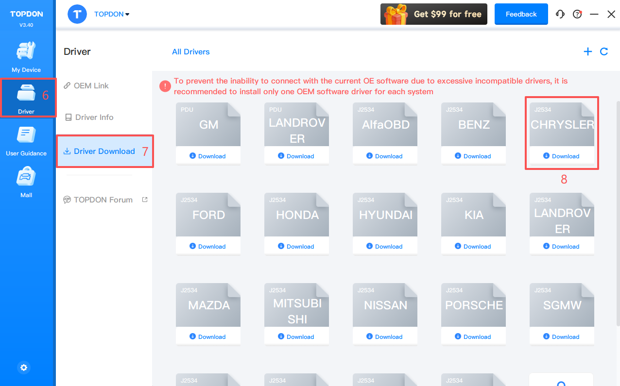 3.Click Driver > Driver Download. Click CHRYSLER and click Download to download the driver Note: Download the corresponding driver according to the OEM software. Do not download drivers that are not related to the OEM software.