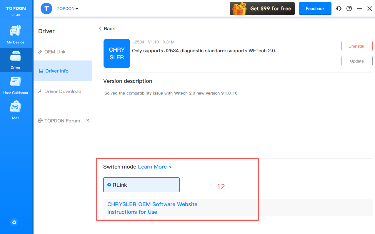 4.Click Driver > Driver Info. Then click CHRYSLER to check the driver mode.
