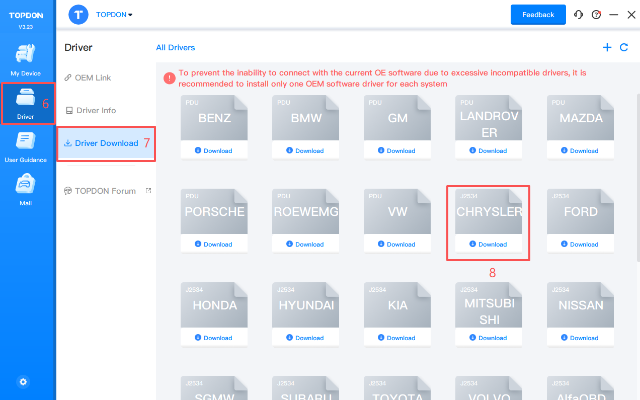 3. Click Driver > Driver Download.Click CHRYSLER and click Download to download the driver.