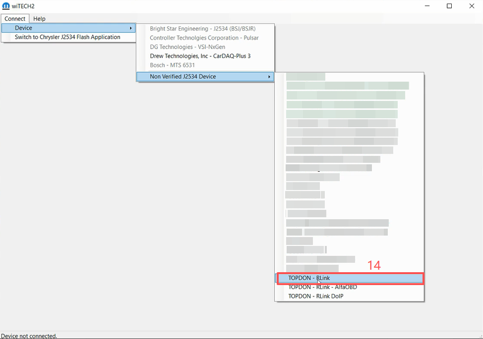 6. Double click the icon to open the wiTECH 2.0. Click Connect > Device. Then click Non Verified J2534 Device and choose TOPDON - RLink.