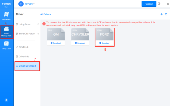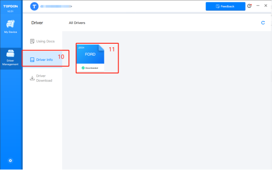 5. Click Driver Management > Drive Info. Then click FORD to configure the driver mode.