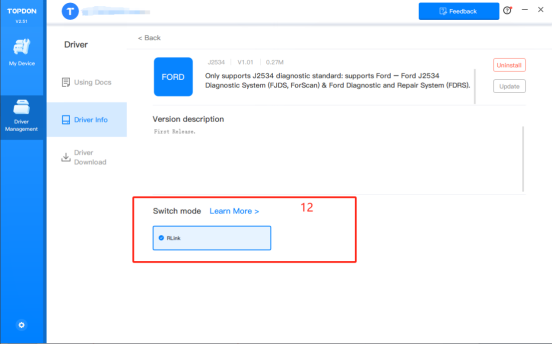 6. When using RLink X3 devices, select RLink as the diagnostic interface on the OEM software. If you are connecting to the original VCI or third-party VCI, open the OEM software and select the original VCI or third-party VCI as the diagnostic interface. This driver will not have any impact.