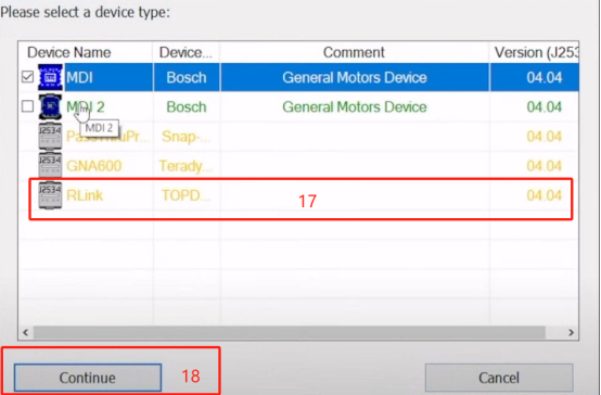 11. When multiple drivers appear, select the RLink driver and click the "Continue" button.