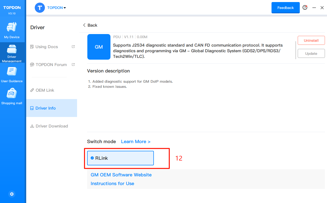 4. Click Driver > Driver Info. Then click GM to configure the driver mode.