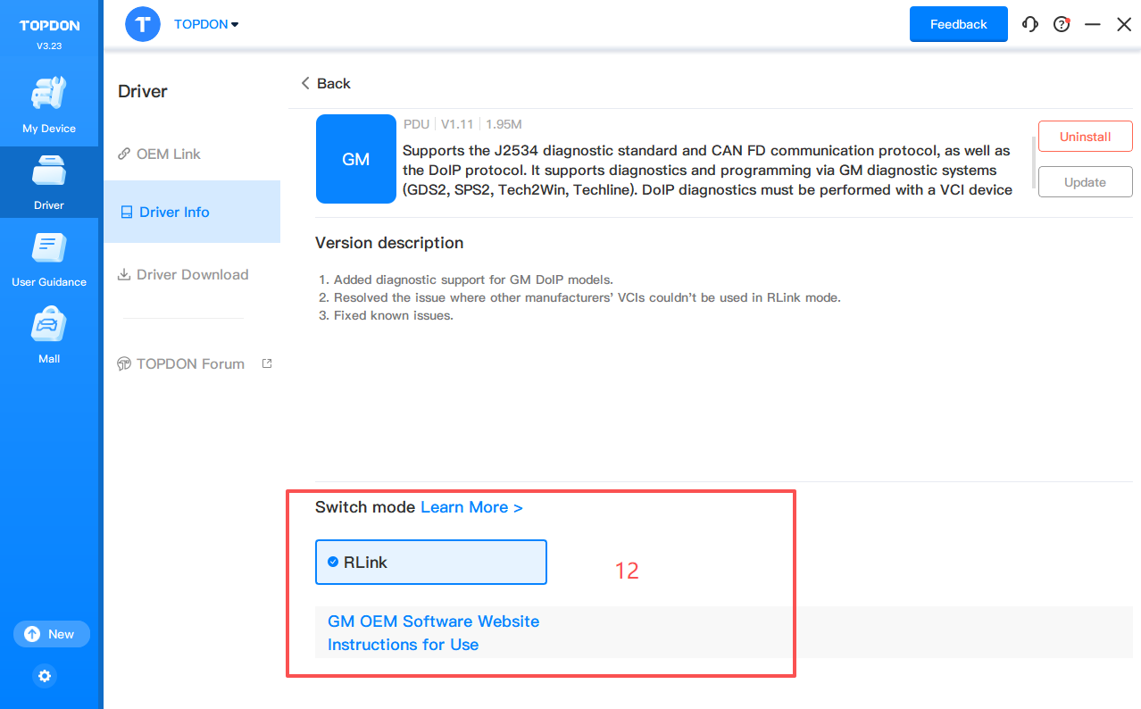 Note: Download the corresponding driver according to the OEM software. Do not download drivers that are not related to the OEM software.4. Click Driver > Driver Info. Then click GM to configure the driver mode.