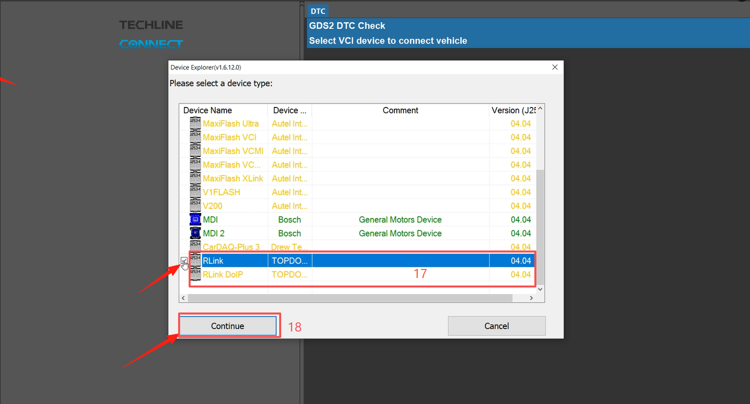 10. When multiple drivers appear, select the RLink driver and click the "Continue" button.
