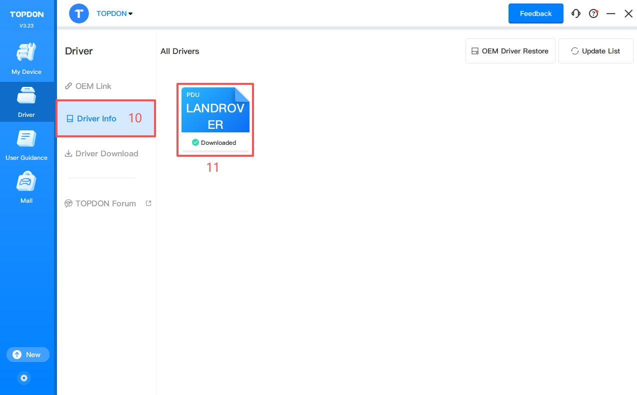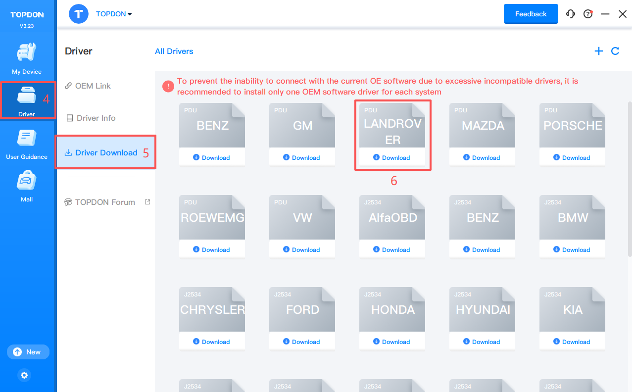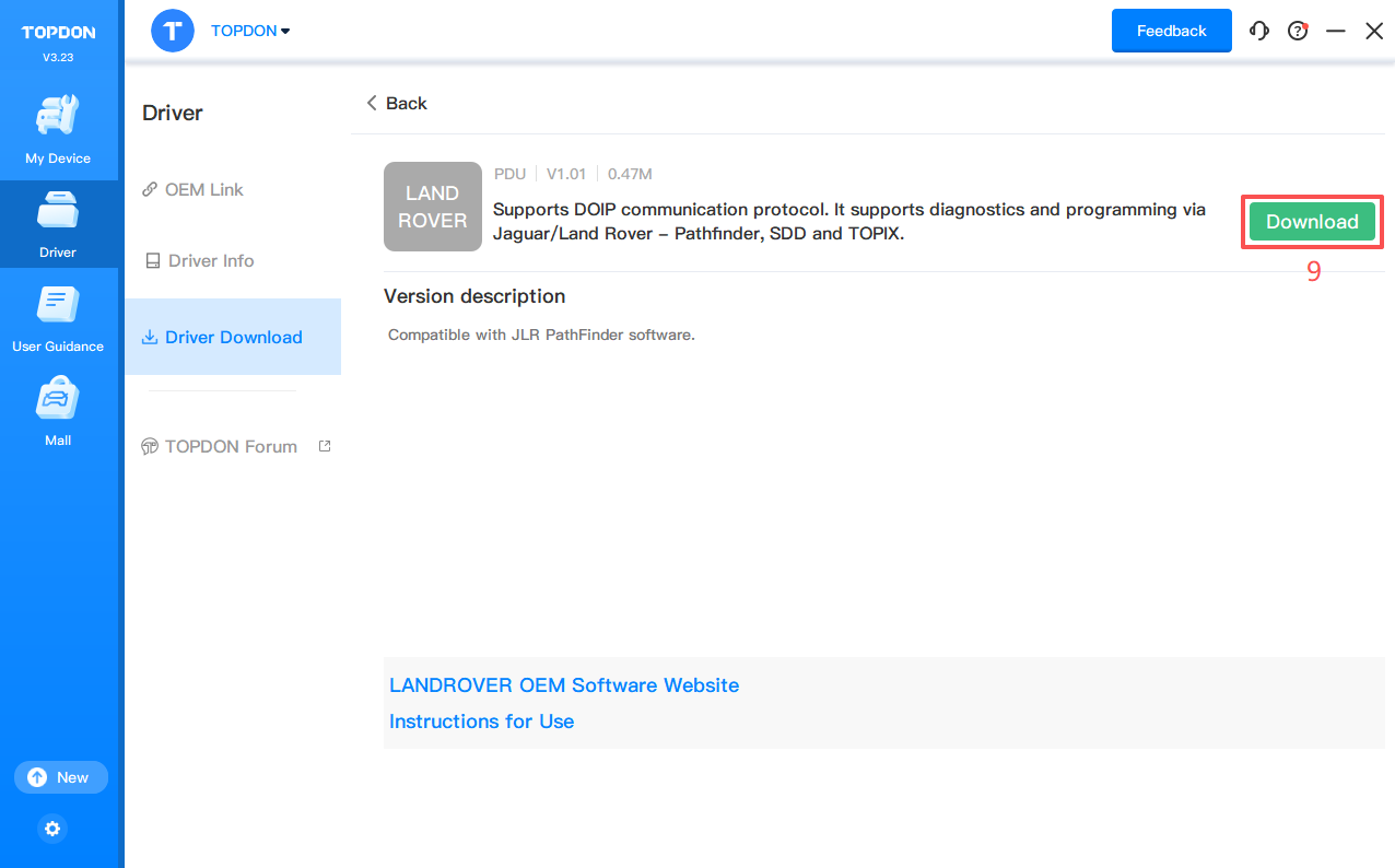 3. Click Driver > Driver Download. Click LANDROVER and click Download to download the driver.