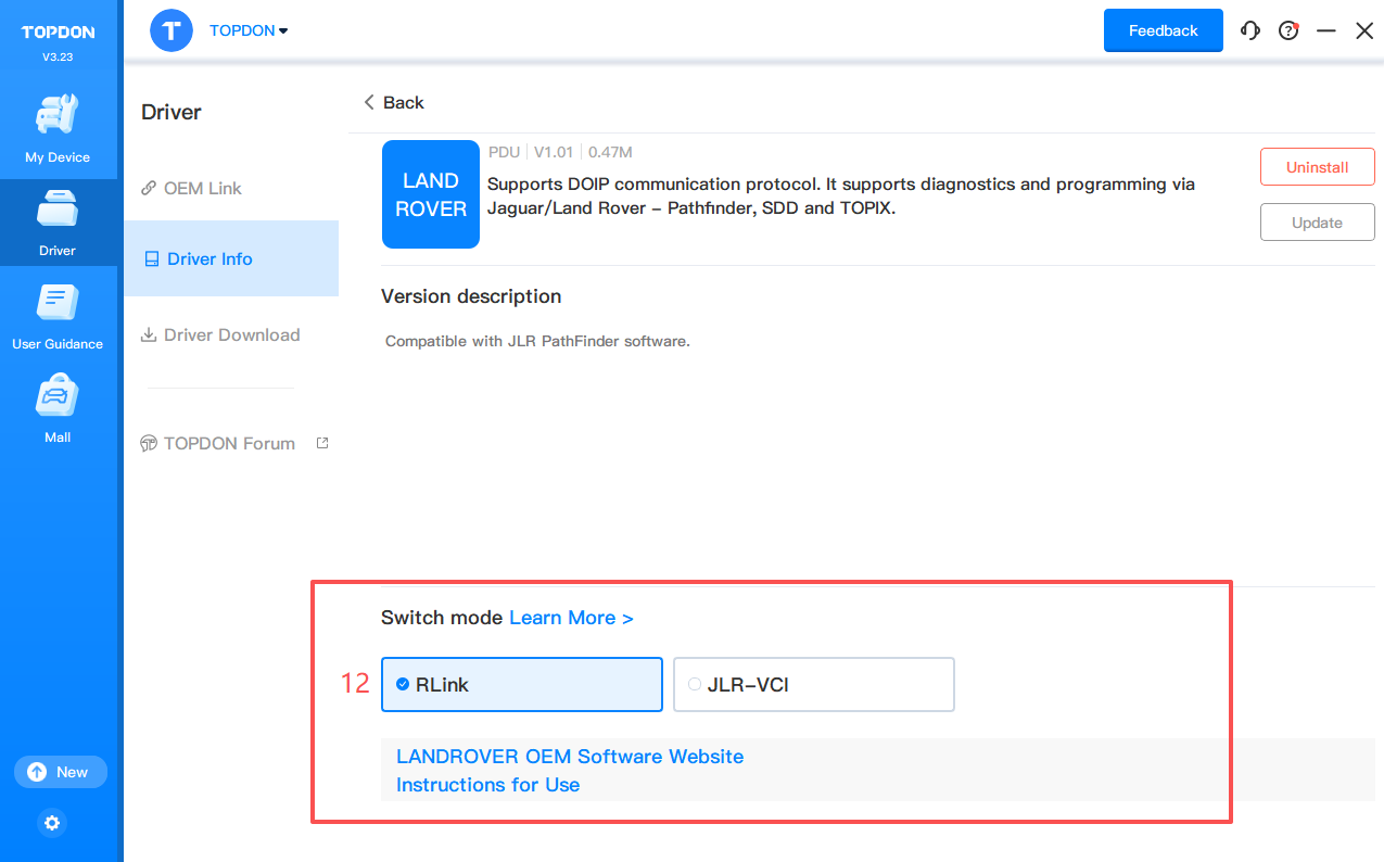 4. Click Driver > Driver Info. Then click LANDROVER to configure the driver mode.
