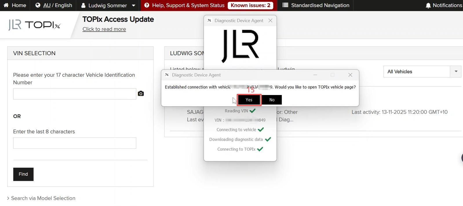 8.After logging in, the system will automatically recognize the vehicle. Once recognition is complete, click [Yes] to successfully enter the vehicle diagnostic system.