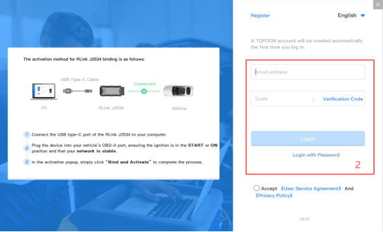 1. Launch the RLink Platform and click Login to the Account. You will be redirected to the login interface, where you can either register a new account or log in.