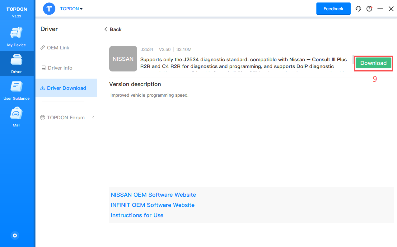 3. Click Driver > Driver Download. Click NISSAN and click Download to download the driver