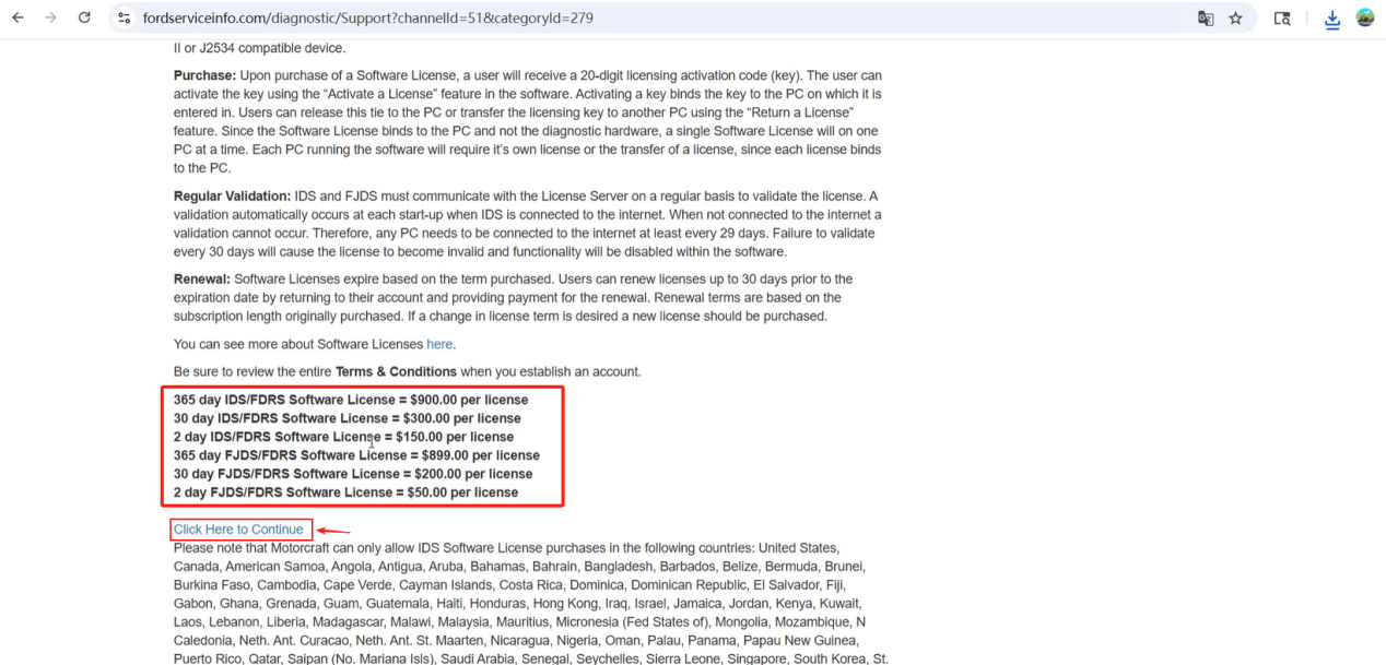 2. Carefully read the information on the web page, confirm the price, and click Click Here to Continue. Purchase a license as needed.