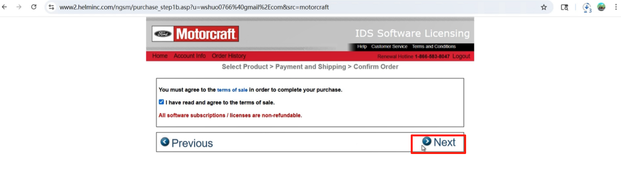 6. Tick the check box “I have read and agree to the terms of sale.” and click Next.
