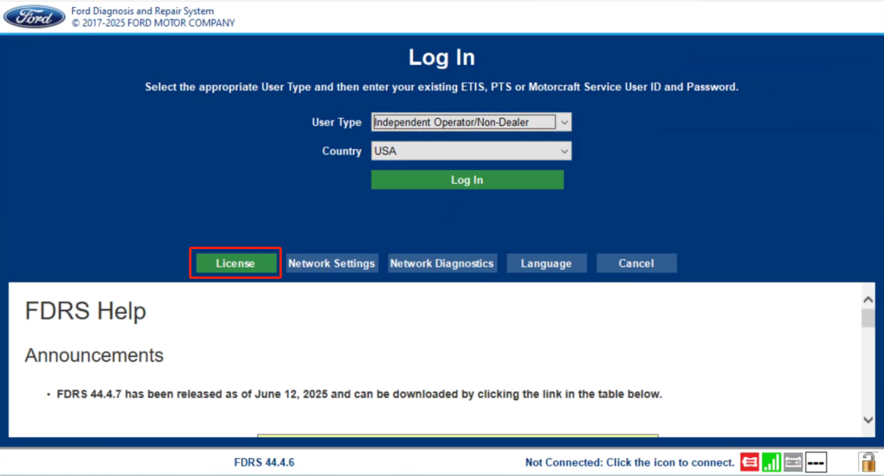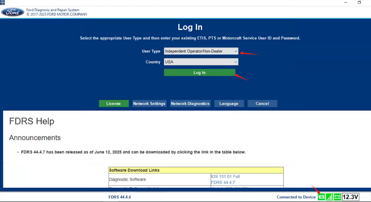 4. After the connection is finished, the VCI-shaped icon will turn green. Choose Independent Operator/Non-Dealer from the pull-down list and click Log In.