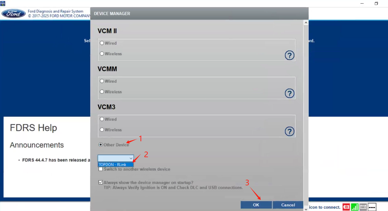 3. Choose Other Device, select TOPDON - RLink from the pull-down list and click OK.