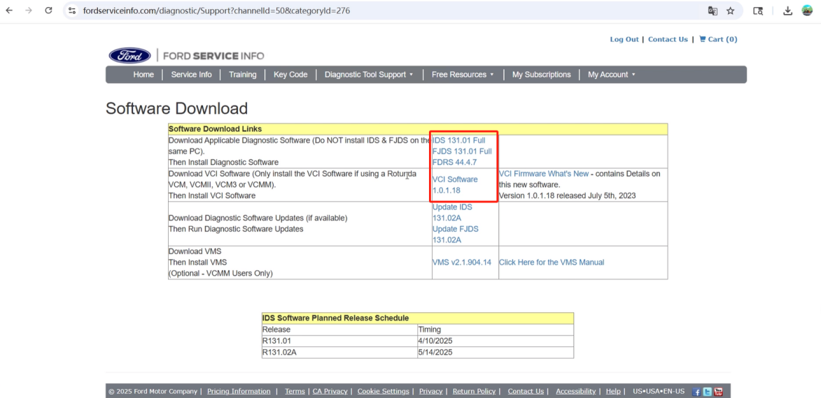7. Click the name of the desired diagnostic software and VCI software to download.