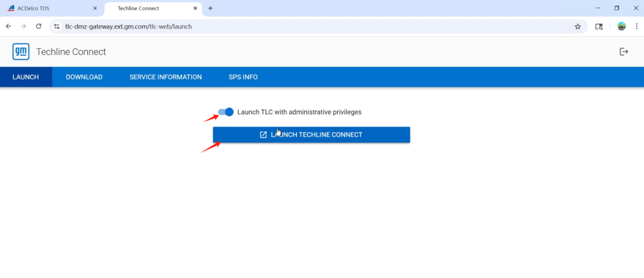 2. Click the button to enable Launch TLC with administrative privileges. Click LAUNCH TECHLINE CONNECT.