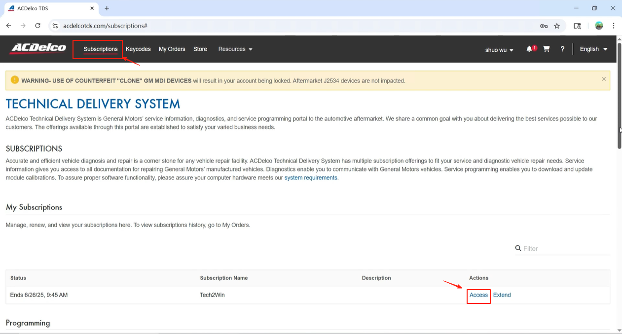 1. Once the payment is complete, click Subscriptions from the top menu, navigate to SUBSCRIPTIONS > My Subscriptions on the web page, and locate your newly purchased subscription. Click Access to open the Techline Connect (hereinafter referred to as “TLC”) website.