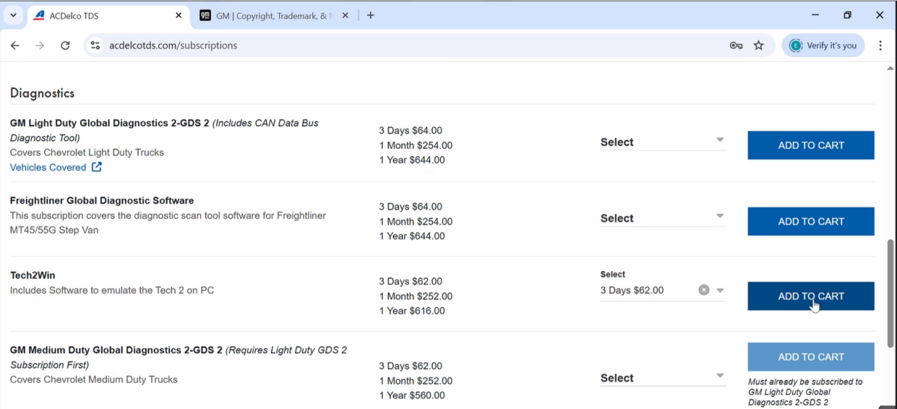 6. Choose the diagnostic software you want to purchase, click Select, choose the quantity from the pull-down list, and click ADD TO CART.