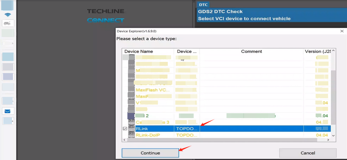 4. Select RLink from the device type table and click Continue.