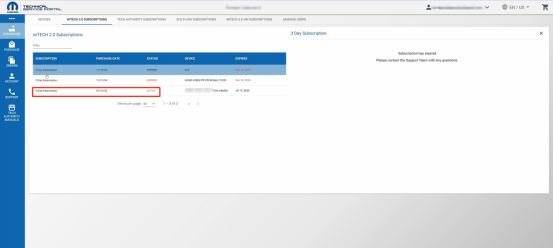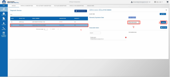 4. Once the purchase is complete, assign the wiTECH 2.0 Subscription. Ensure that the serial number matches the device bound to the computer.