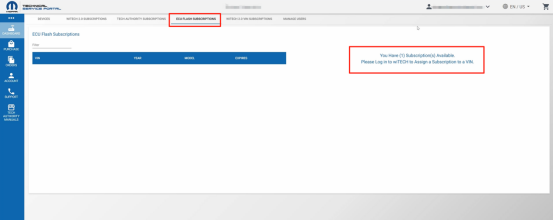 7. The ECU Flash Subscription must be assigned before logging into wiTECH 2.0 for ECU programming.