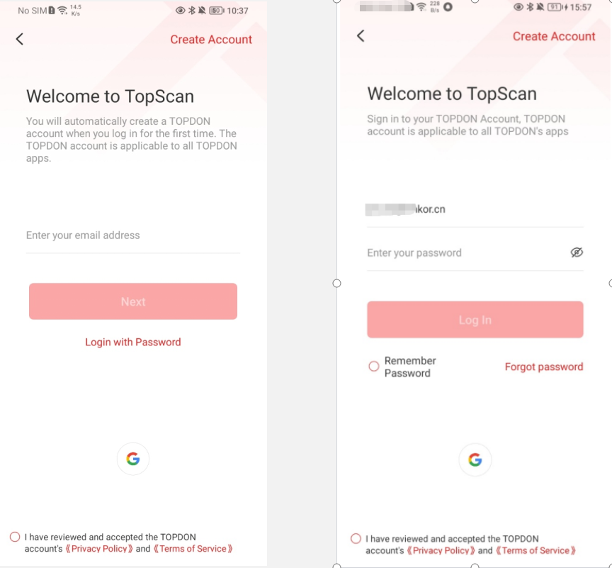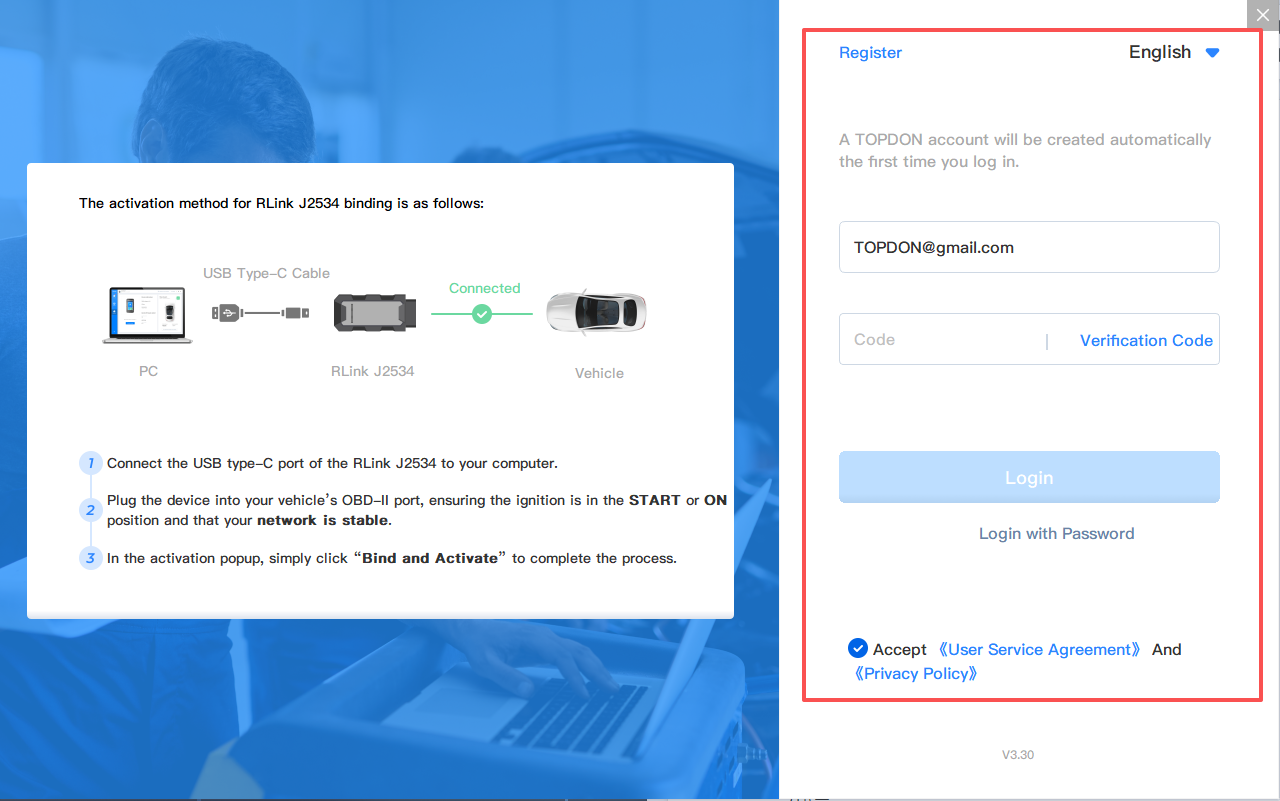 Note: If you have registered an account on the RLink Platform and successfully claimed the 1-year TopScan benefits, you can directly log in to the TopScan App with the account. If RLink J2534 or RLink X7 is not linked to the account you use to log in to RLink Platform, it is recommended to download RLink Platform for device linking and activation first.3. Log in to Your Account