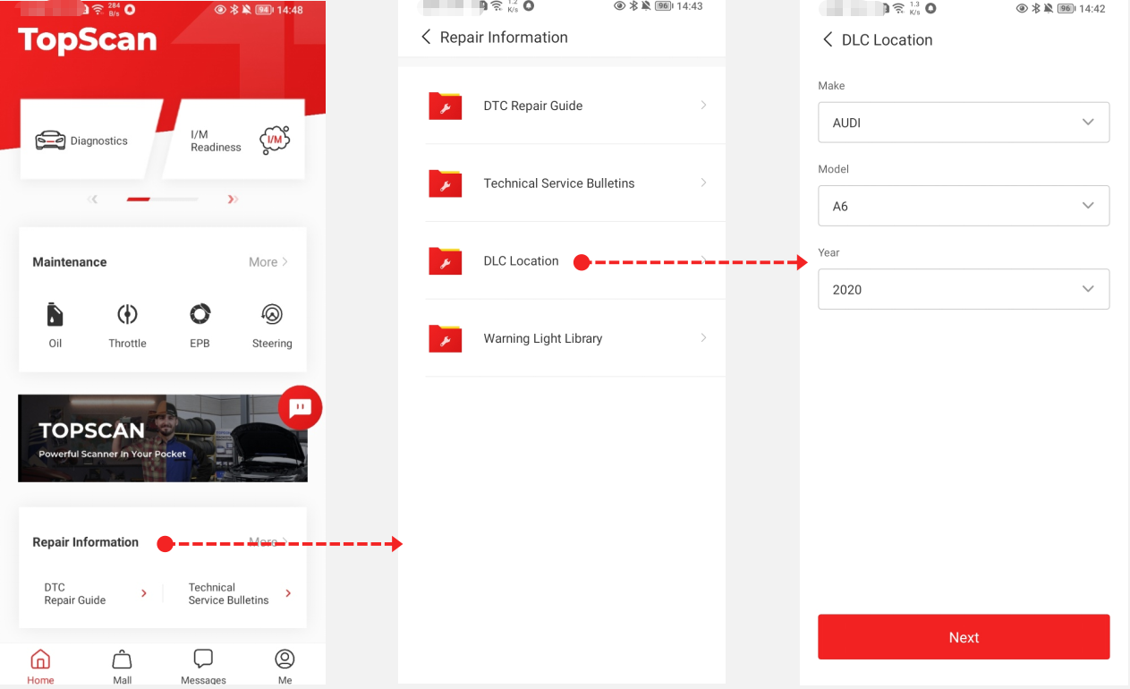 On the homepage, tap Repair Information > DLC Location. Then select the vehicle's make, model, and year, and tap Next. An image showing the DLC location for the selected vehicle will be displayed.