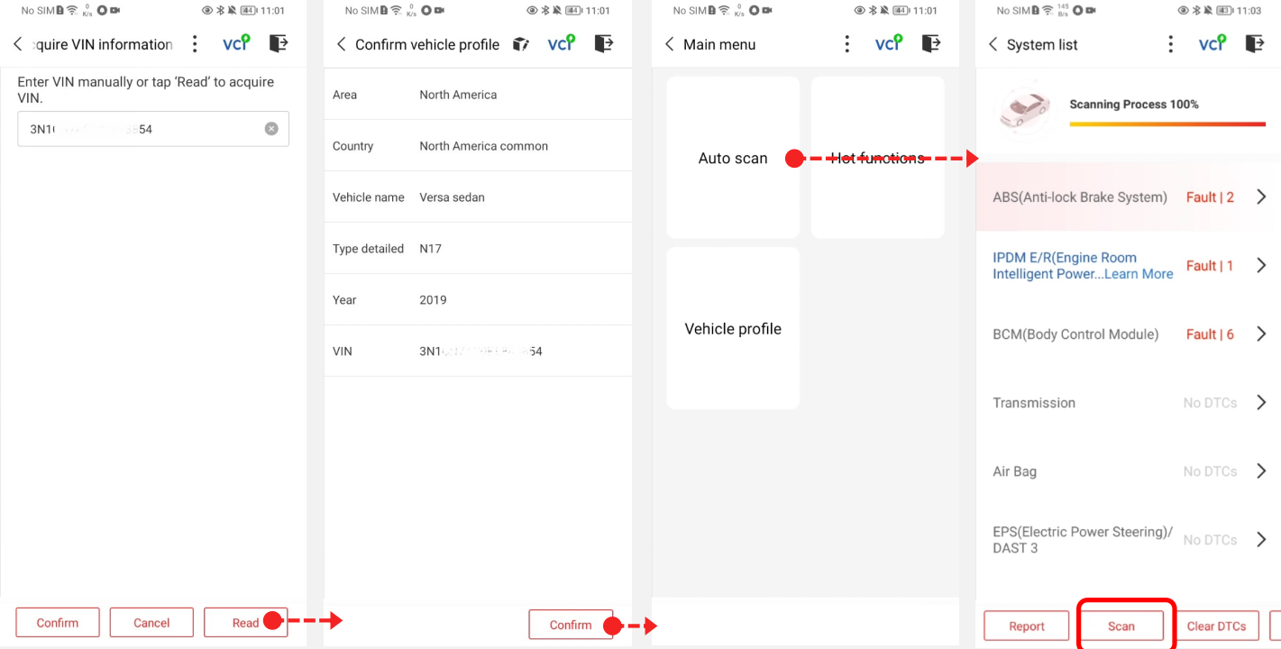 ④ Tap Read to acquire the Vehicle Identification Number (VIN), then tap Confirm after verifying the vehicle information.
