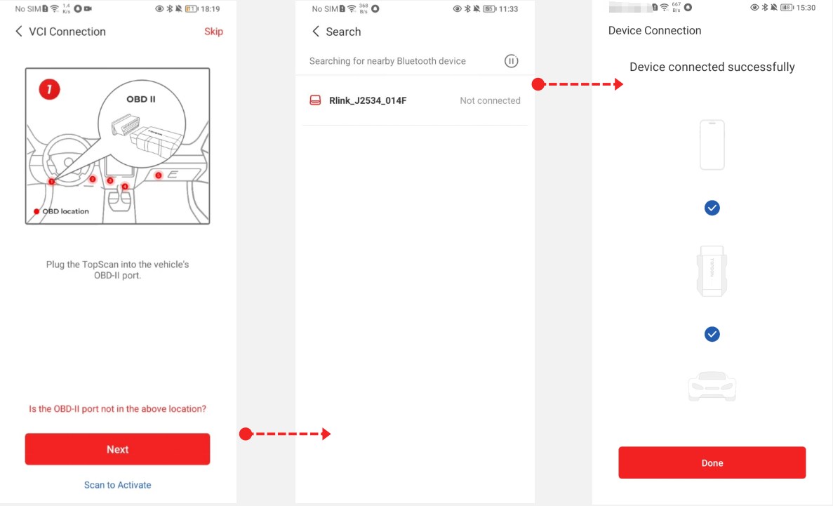① Ensure your phone's Bluetooth is enabled. Tap Next, turn the vehicle ignition switch to ON, confirm that the red indicator on the device is steadily lit, and tap Next to begin searching for the device.