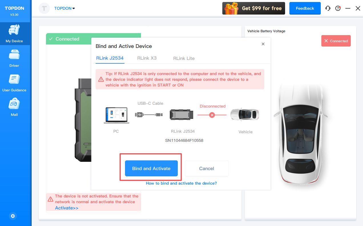 ② Connect the RLink J2534 or RLink X7 to a computer using a USB cable, then click Bind and Activate.
