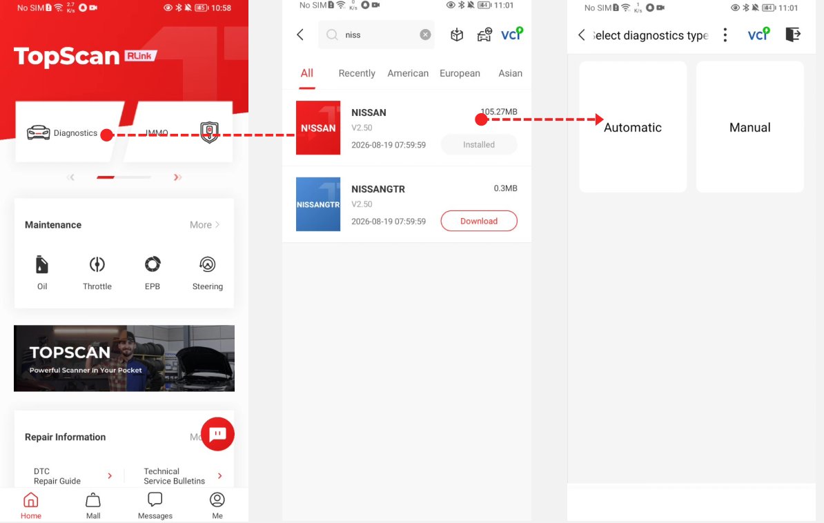Note: Automatic is not applicable to some old models. In this case, please select Manual, and select the vehicle make, model, year and other information in sequence before performing diagnostics.