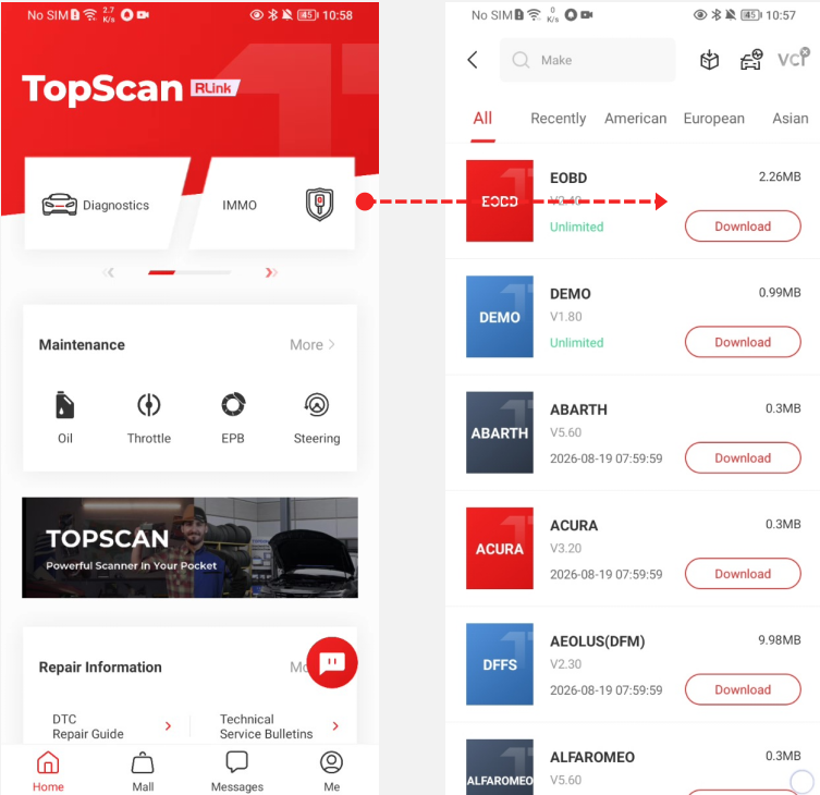 The first time you use the diagnostic functions, you must download the software that matches the vehicle make. Please tap Diagnostics on the homepage, and then download the desired software. After the download is complete, you can perform vehicle diagnostics.