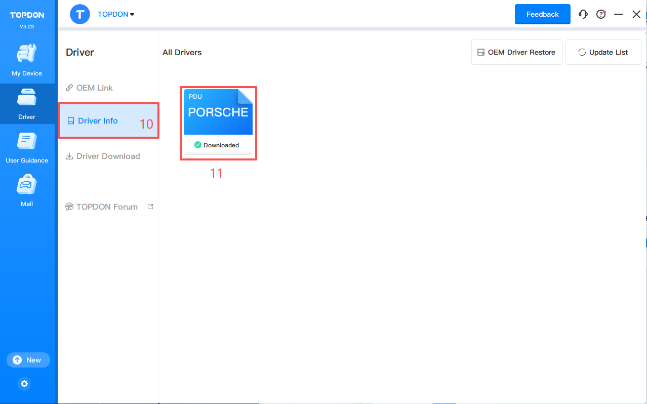 3. Click Driver > Driver Download.Click PORSCHEand click Download to download the driver.