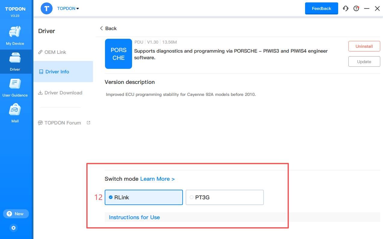 4. Click Driver > Driver Info. Then click PORSCHE to configure the driver mode.