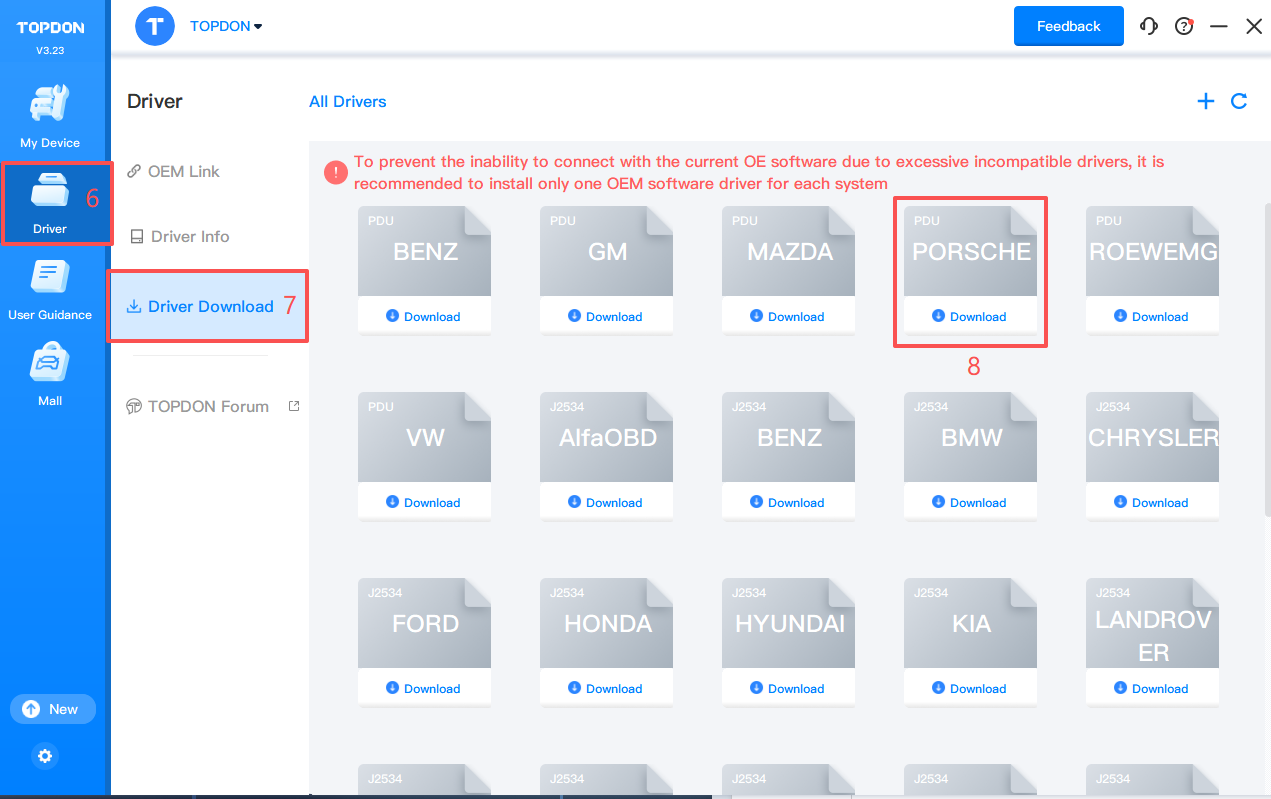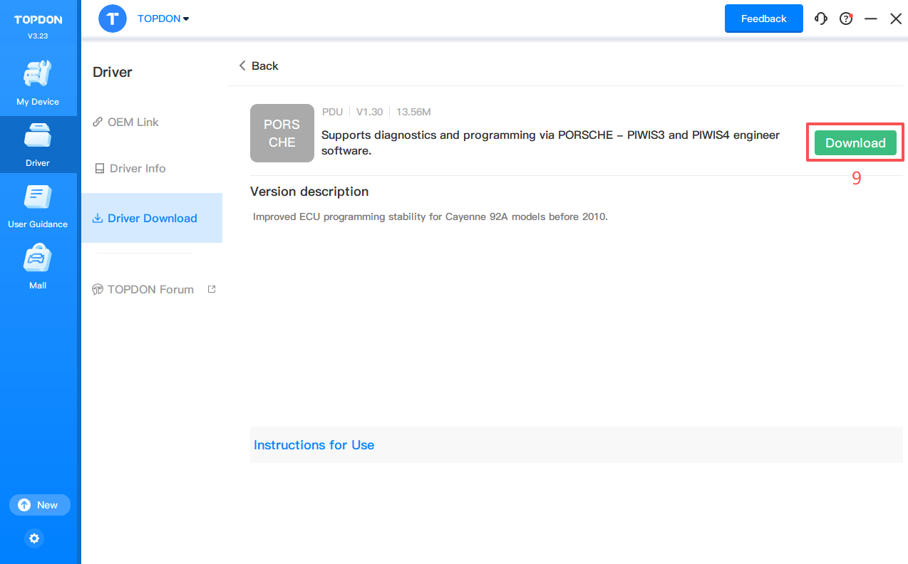 3. Click Driver > Driver Download. Click PORSCHE and click Download to download the driver.