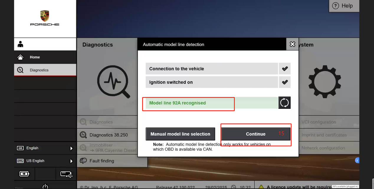 7. Click "Diagnostics" to enter vehicle diagnostics. After the vehicle is recognized successfully, click "Continue" to perform diagnostics.