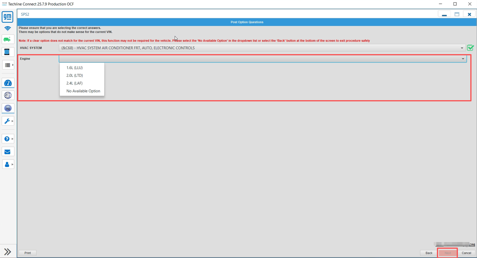 Select the engine model according to the current vehicle configuration and click [NEXT].