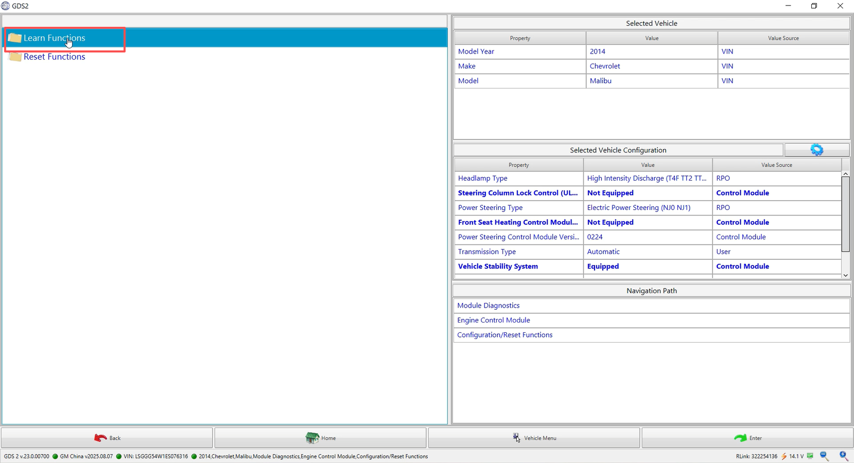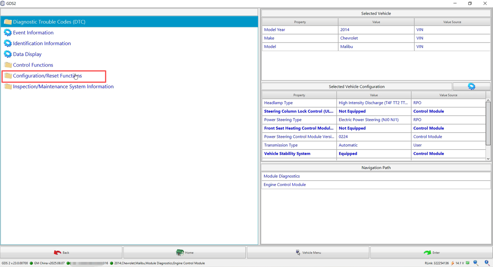 Directly click [Configuration/Reset Functions] to perform data matching for the engine control module.