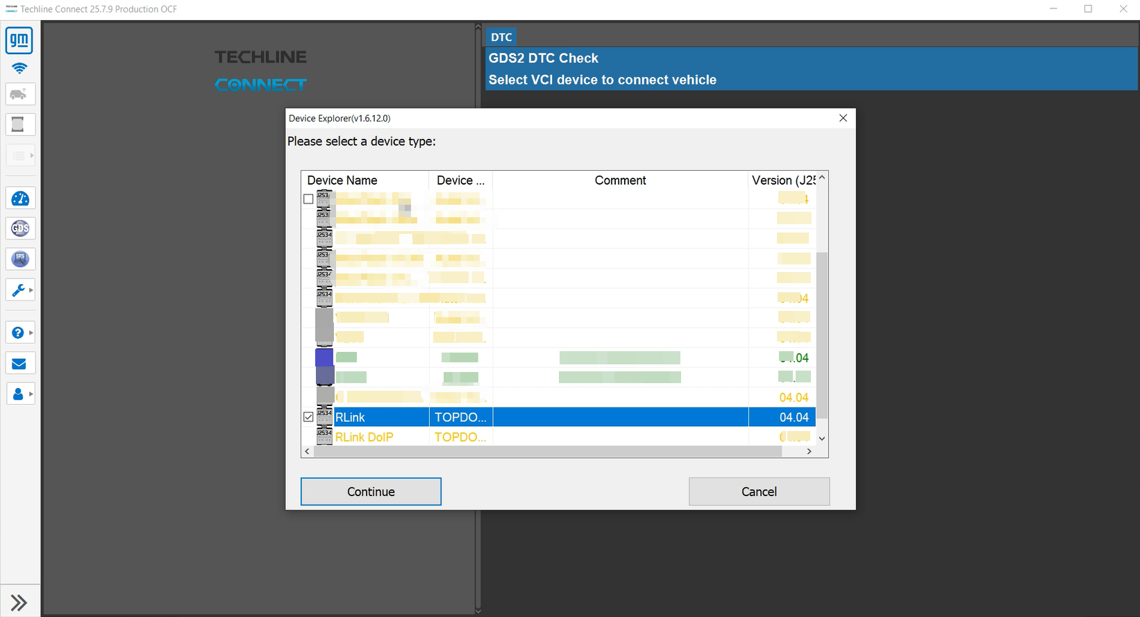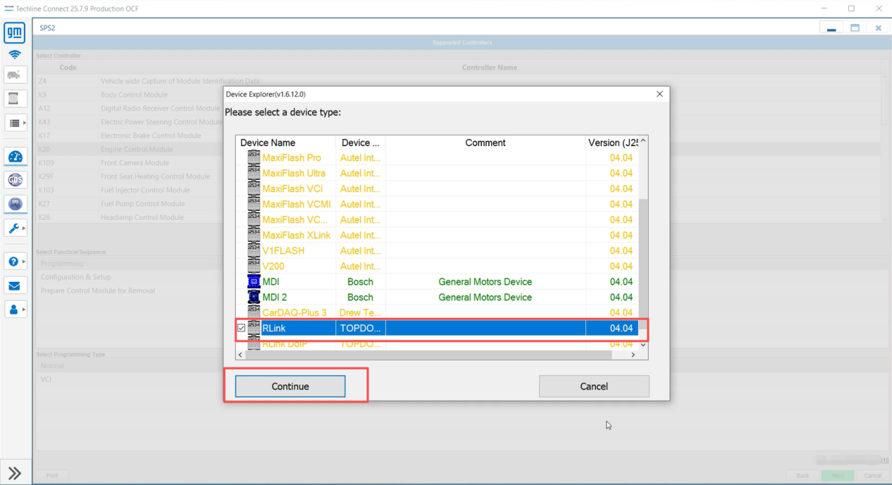 Choose either [RLink] driver mode or [RLink DOIP] driver mode from the options (both modes are compatible with RLink device connection), and click [Continue] after selection.