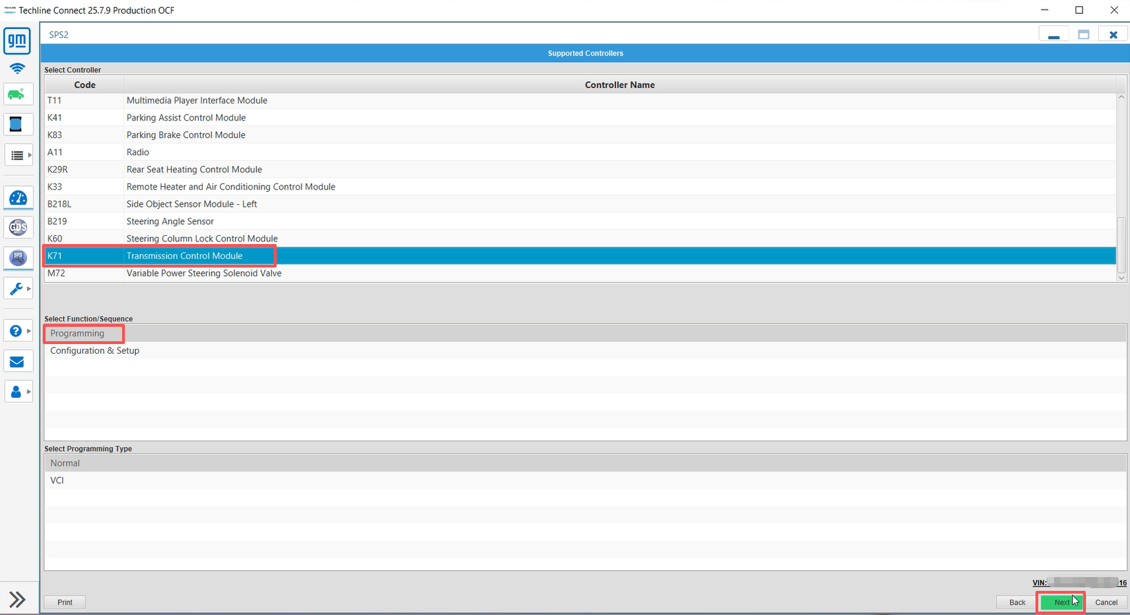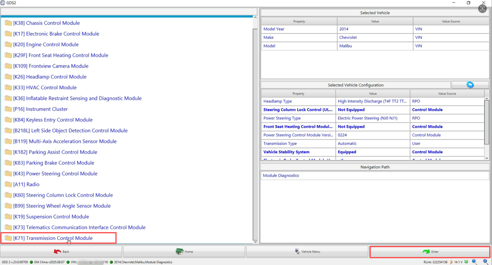 Locate and select [K71 Transmission Control Module] and click [Enter].