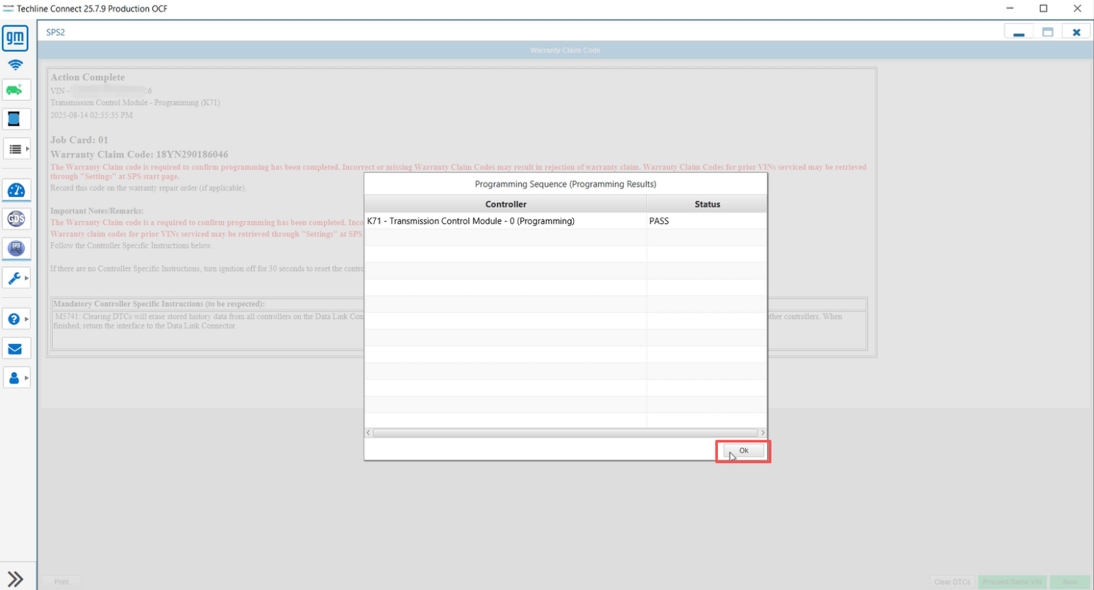 Programming of the Transmission Control Module (TCM) is completed, click [OK].