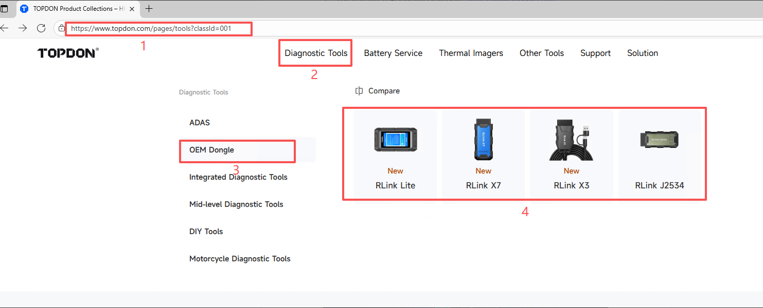 1. Log in to the TOPDON official website: https://www.topdon.com/ 2. Select Diagnostic Tool from the home screen and then click OEM Dongle. 3. Click RLink X3. 4. Click Download. 5. Click the icon to download the RLink Platform software. Note: If the ...