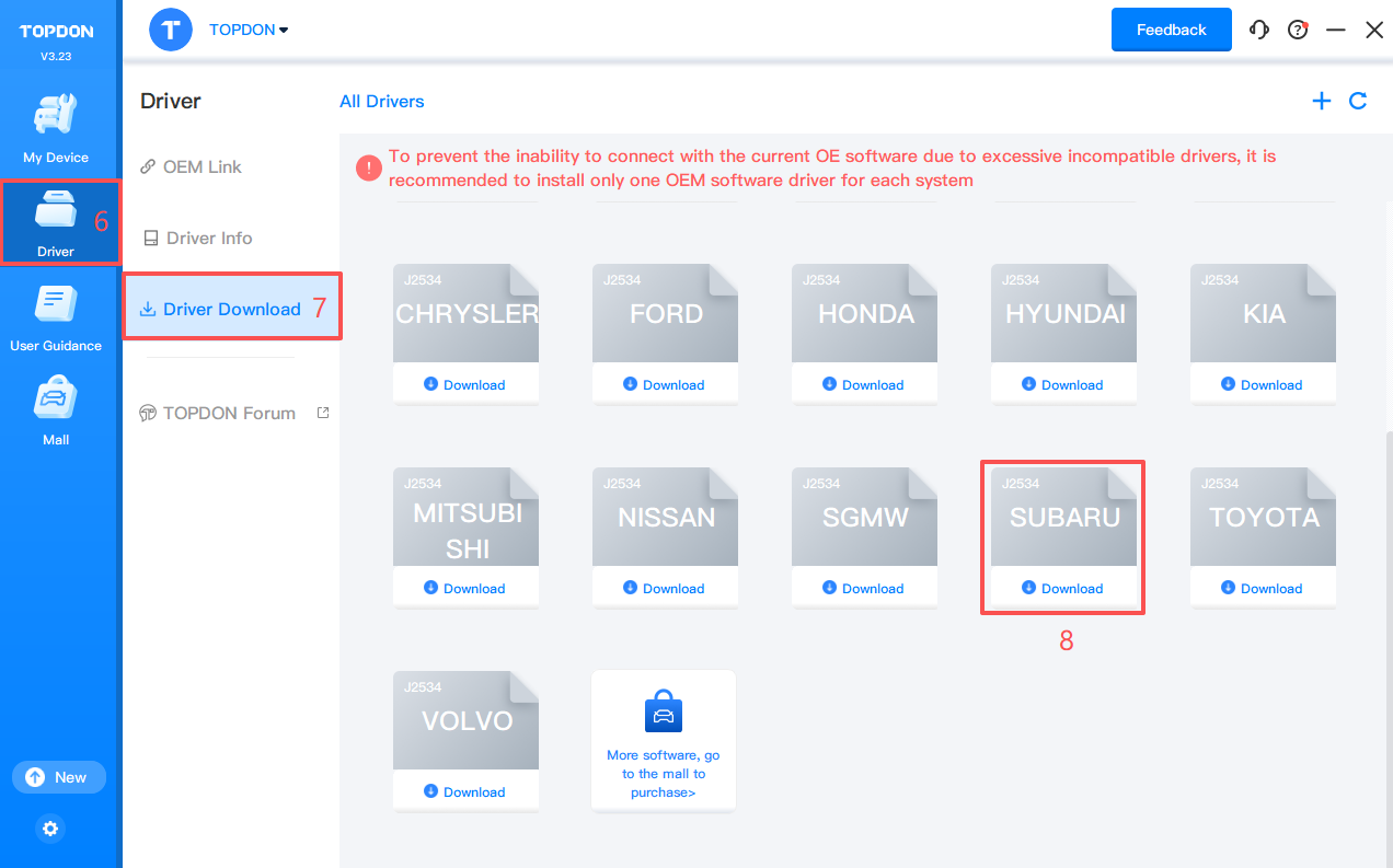 3. Click Driver > Driver Download. Click SUBARU and click Download to download the driver. Note: Download the corresponding driver according to the OEM software. Do not download drivers that are not related to the OEM software.
