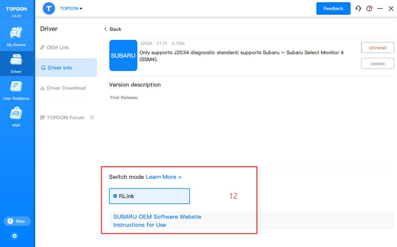 4. Click Driver > Driver Info. Then click SUBARU to configure the driver mode.