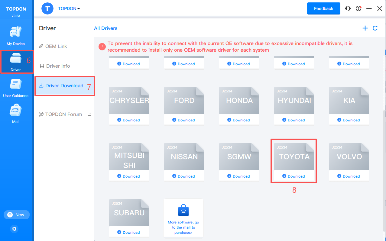 3. Click 【Driver 】 > 【Driver Download】. Click 【TOYOTA】 and click 【Download】 to download the driver.